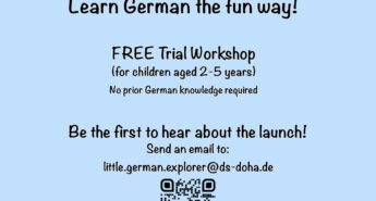 Lerne Deutsch auf spielerische Weise! Kostenloser Schnupper-Workshop! (für Kinder im Alter von 2–5 Jahren) Keine Deutschkenntnisse erforderlich! Sei unter den Ersten, die vom Start erfahren! Sende eine E-Mail an: little.german.explorer@ds-doha.de