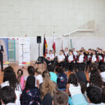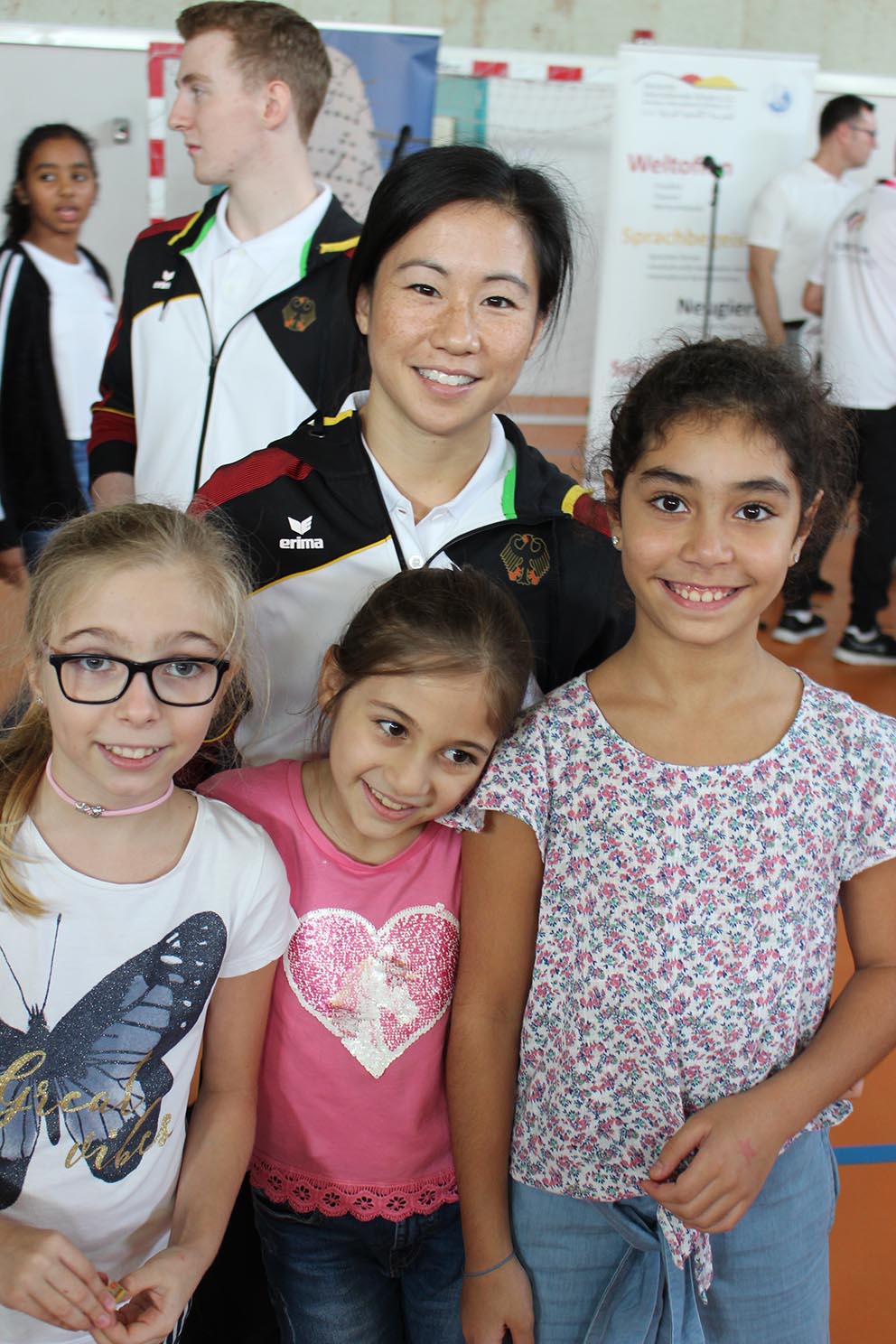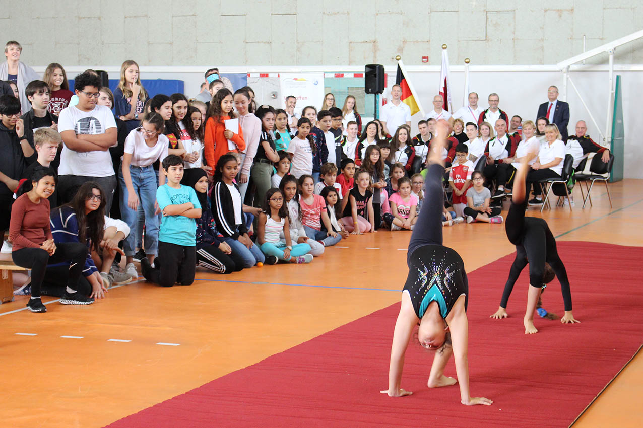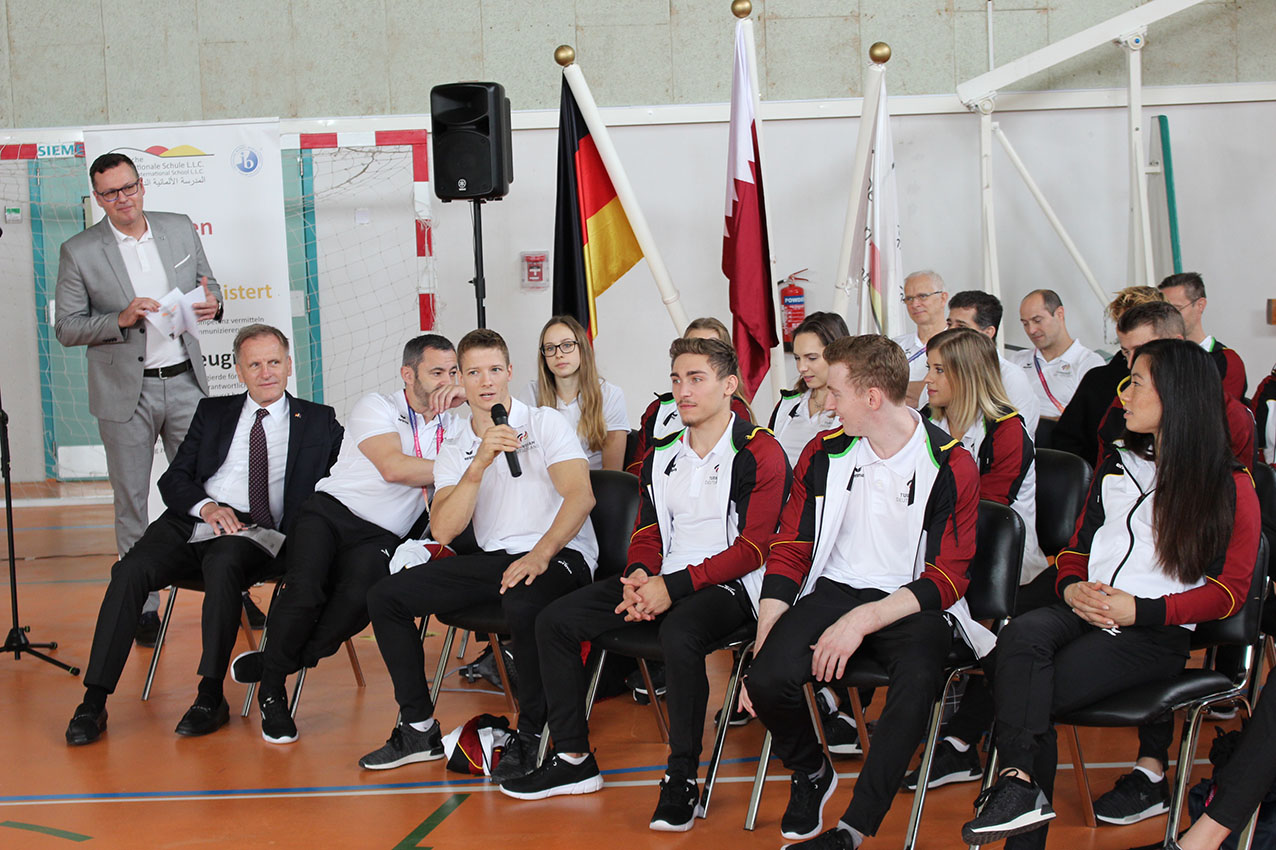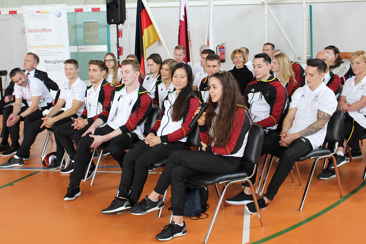 In Anwesenheit des deutschen Botschafters in Katar Herrn Hans-Udo Muzel, der den Turnerinnen und Turnern viel Erfolg bei den Weltmeisterschaften wünschte, konnten alle Schülerinnen und Schüler der Klassenstufen 4 bis 12 die Spitzensportler kennenlernen. Zwei Schülerinnen der Klassenstufe 5, Jana und Manar, führten zu Beginn ihre besten Turnübungen vor, anschließend fand eine Diskussion mit Schülerinnen und Schülern statt. So bekam die Schülerschaft der Deutschen Internationalen Schule Doha einen kleinen Einblick in das Leben eines Spitzensportlers: