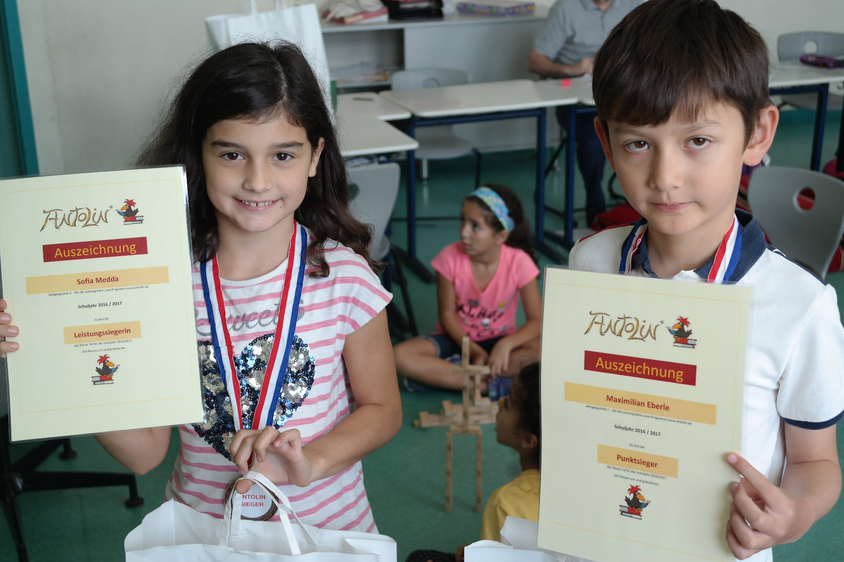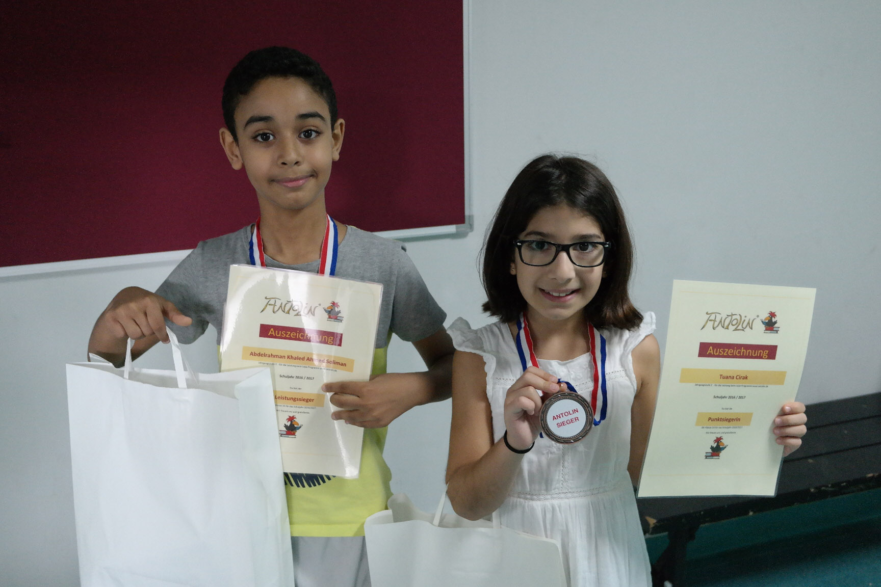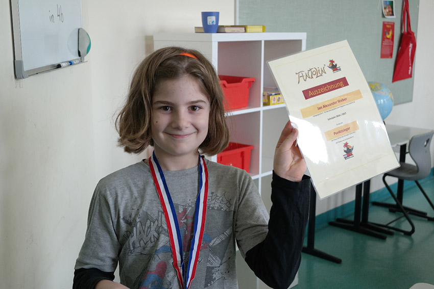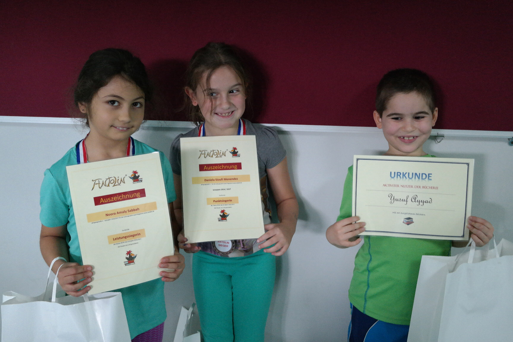 Am Sonntag verteilten die Deutschlehrer in ihren Klassen die Urkunden, Medaillen und Geschenke für die Antolin-Gewinner des vergangenen Schuljahres. Der Schulgewinner erhielt ein Kindle E-Book, die Klassensieger Science-Boxen und Arts-and-Crafts-Sets. Wir bedanken uns bei Frau Karnebogen und Kinder aus der 4. Klassen, die die Spendenbox gestalteten und ein besonderer Dank geht an Daniela Fakhoury und die Eltern, die durch ihre Spenden die Geschenke möglich gemacht haben.