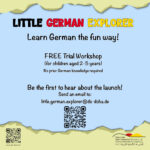 Lerne Deutsch auf spielerische Weise! Kostenloser Schnupper-Workshop! (für Kinder im Alter von 2–5 Jahren) Keine Deutschkenntnisse erforderlich! Sei unter den Ersten, die vom Start erfahren! Sende eine E-Mail an: little.german.explorer@ds-doha.de