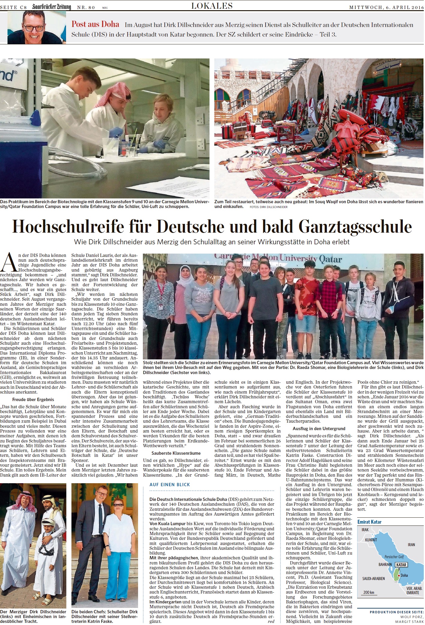Anbei ein neuer Artikel über die Deutsche Internationale Schule Doha vom 18.12.2015 aus der »Saarbrücker Zeitung«: Kennen Sie schon unsere neuen Bildergalerien auf der Homepage? Schauen Sie mal vorbei und sehen Sie die Bilder unserer Schul-Veranstaltungen in den letzten Wochen > Klicken Sie hier!