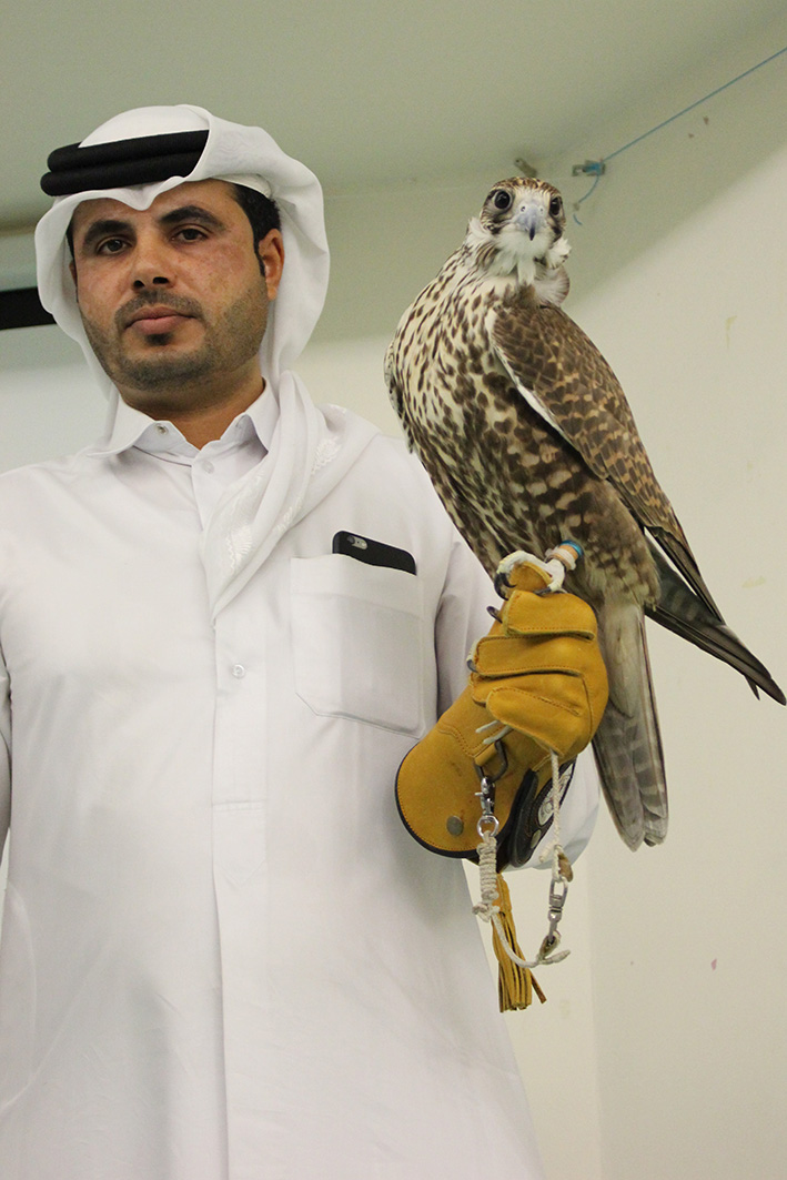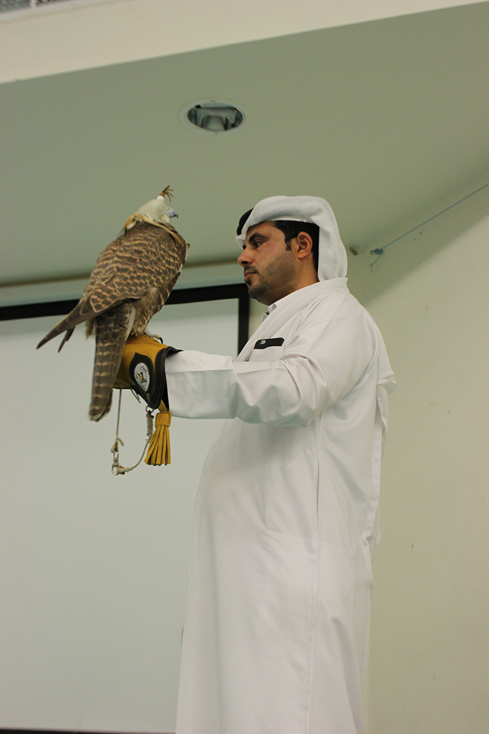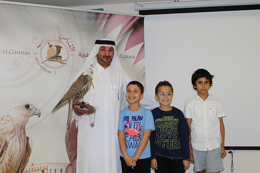 Bilder vom spannenden Besuch aus Katara am 14. März 2017: Mr Amer Al Neami der Qatari Society of AlGannas präsentierte der Grundschule diesen traditionellen Sport Katars und zeigte den Kindern die Falken hautnah – auch eine Flugrunde im Auditorium fehlte nicht!