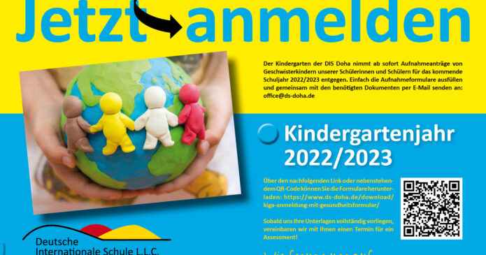 Der Kindergarten der DIS Doha nimmt ab sofort Aufnahmeanträge von Geschwisterkindern unserer Schülerinnen und Schülern für das kommende Schuljahr 2022/2023 entgegen. Einfach die Aufnahmeformulare ausfüllen und gemeinsam mit den benötigten Dokumenten per E-Mail senden an: office@ds-doha.de Über den nachfolgenden Link oder QR-Code können Sie die Formulare herunterladen: https://www.ds-doha.de/download/kiga-anmeldung-mit-gesundheitsformular/ Sobald uns Ihre Unterlagen vollständig vorliegen, vereinbaren […]