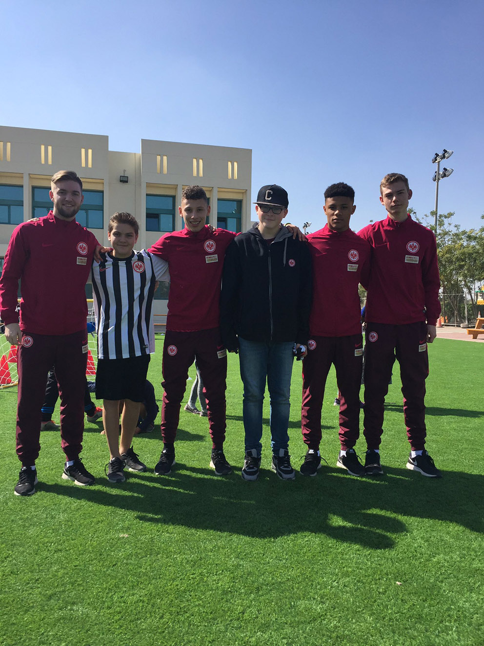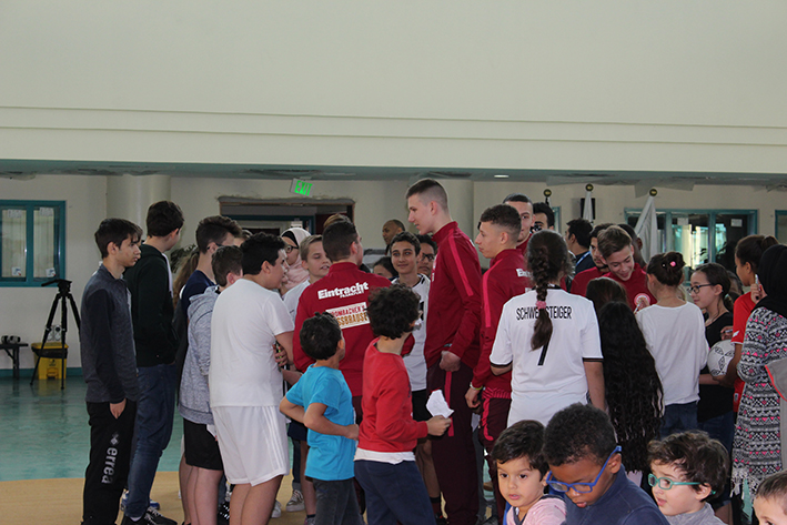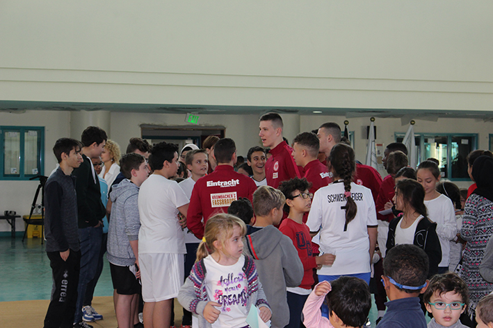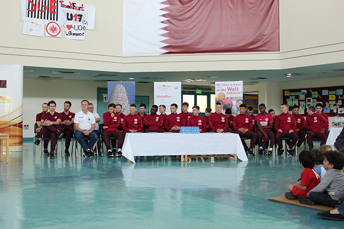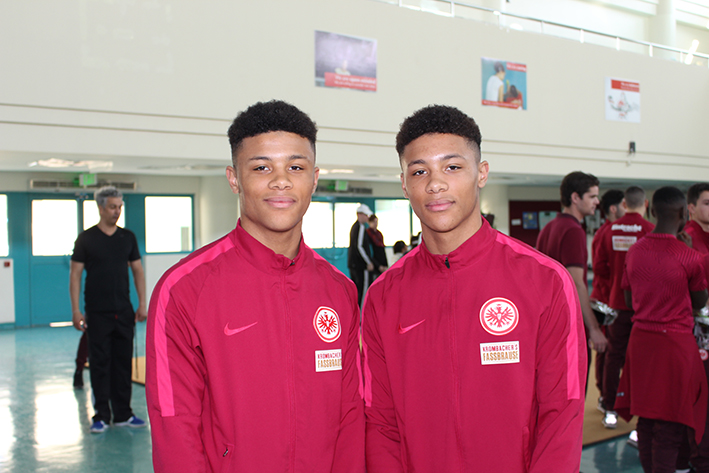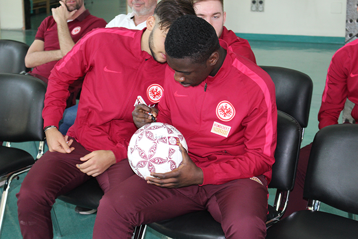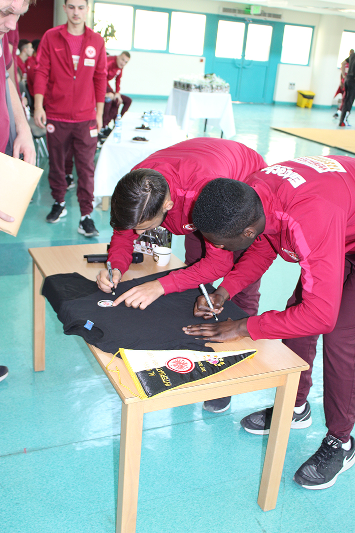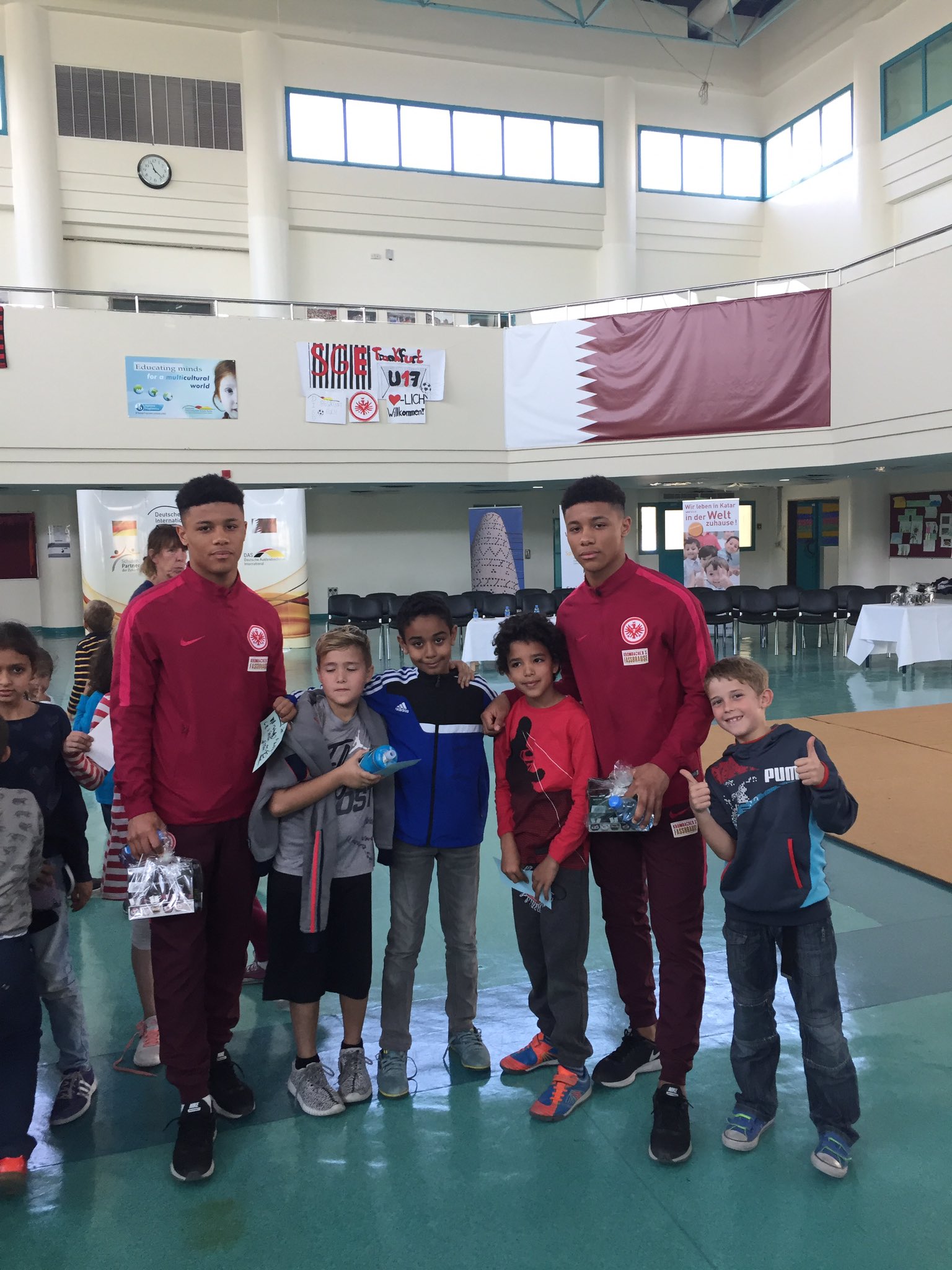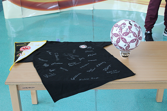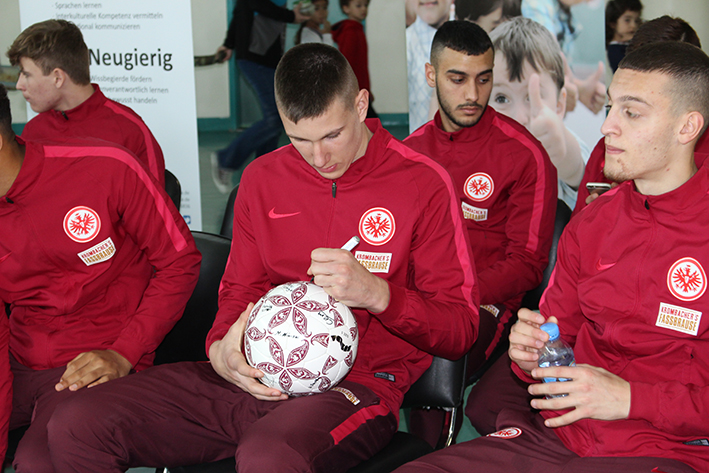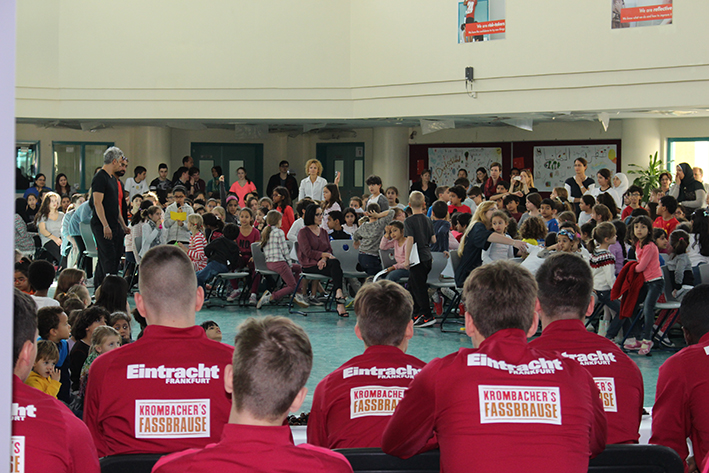 Am 24.1. war die U17 Eintracht Frankfurt an der Schule zu Besuch. 20 Spieler, begleitet durch Trainer und Betreuer, wurden begeistert von der Schulgemeinschaft empfangen: Autogramm- und Fragestunde, gemeinsames Kicken auf dem Sportplatz der Schule, Selfies! Nah bei den Fußballstars von morgen … Wir drücken der Eintracht die Daumen für den Cup am 31. Januar!
