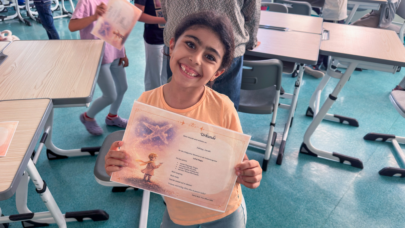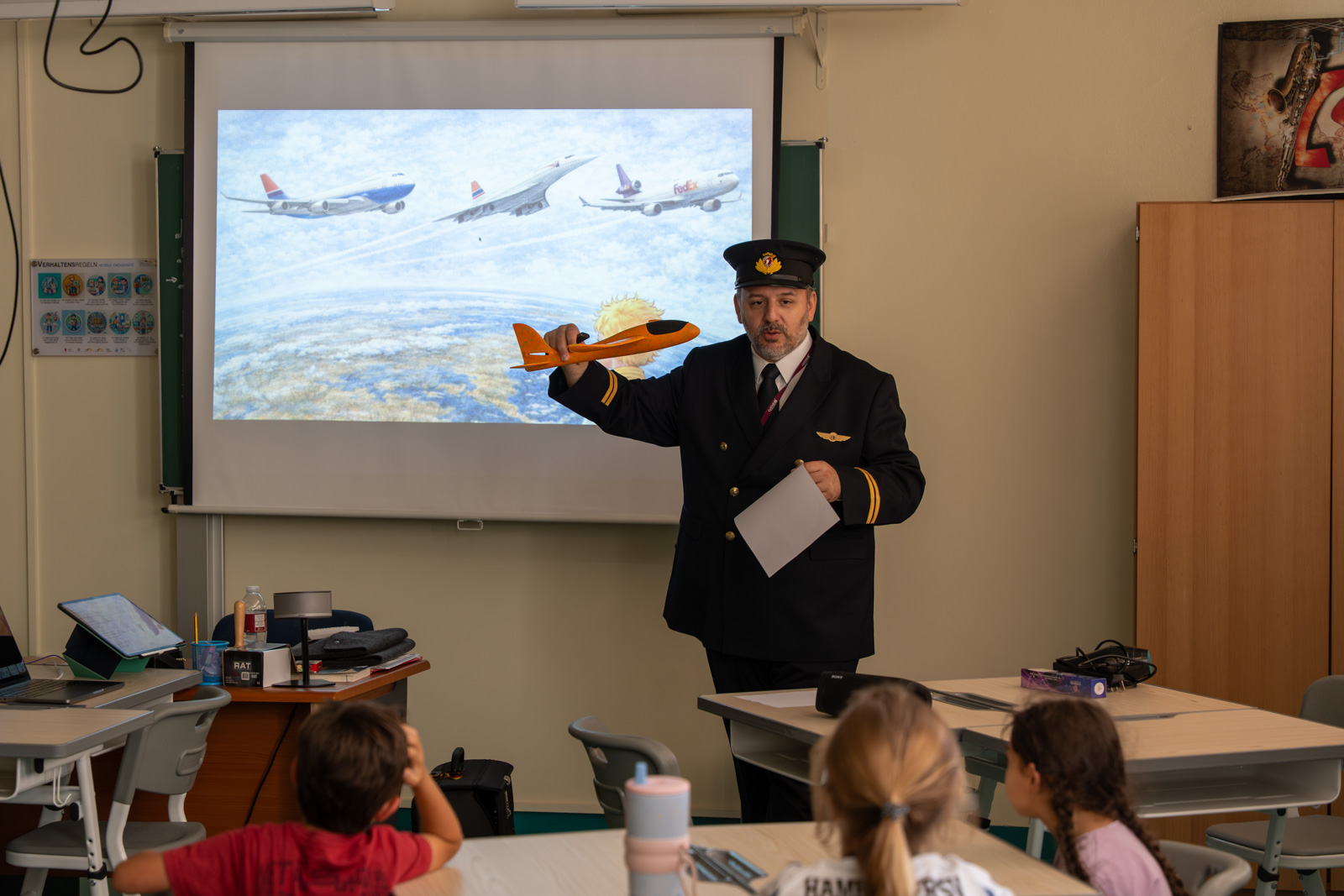 Zum Abschluss unserer Reihe bekamen wir noch besonderen Besuch: Ein echter Pilot von Qatar Airways kam zu uns in die Schule. Am Projekttag erklärte er uns alles rund ums Fliegen. Gemeinsam führten wir weitere Experimente durch und konnten viele Fragen stellen.