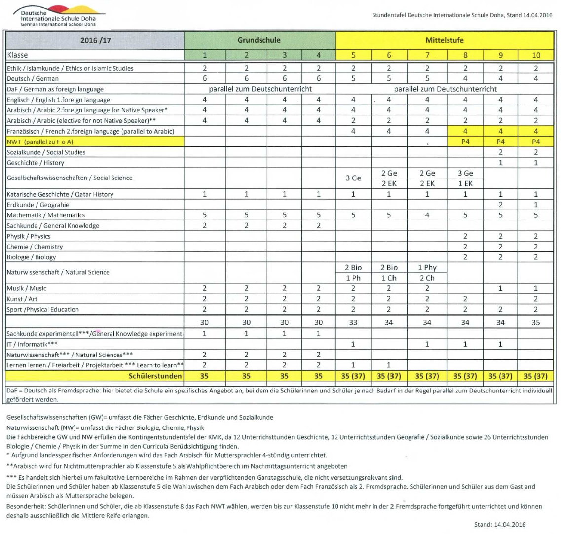 The studied subjects are listed in the lesson table above. The language of instruction is normally German, however selected classes are taught bilingual. The school offers additional to the regular schedule, in order to take into account the country-specified background, Islamic studies, Arabic as well as Qatar History. You will be further informed about the pedagogic concepts and offers.