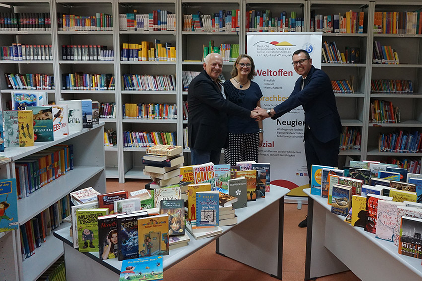 - Fröhliche Übergabe der 1001 Aktions-Bücher am 23.5.2017: Adi Hagelüken von Werktag, Bibliotheksleiterin Monica Menendez-Krüger und Dirk Dillschneider, Schulleiter der Deutschen Internationalen Schule Doha ( v.l.n.r. )