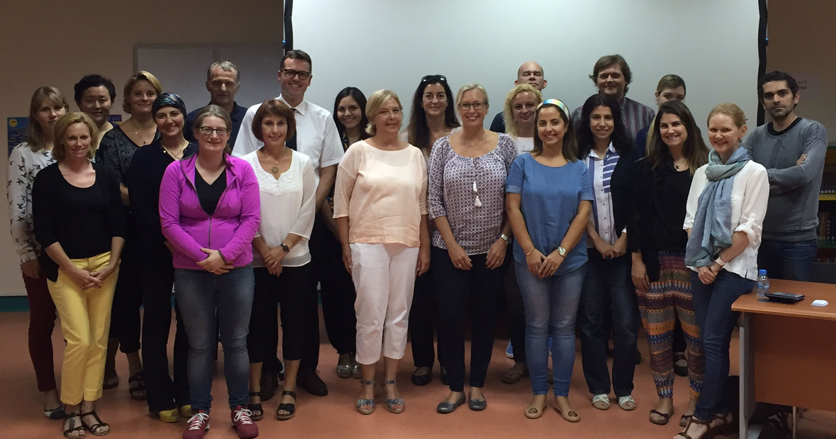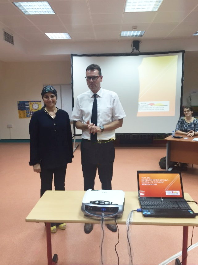 - Die neu gewählten Schulelternbeirätinnen der Deutschen Internationalen Schule Doha Claudia Kaiser (5. v.l.) und Tania Fecht (5. v.r.) umrahmt von den ElternsprecherInnen und/oder ihren Vertretungen und Direktor Dirk Dillschneider