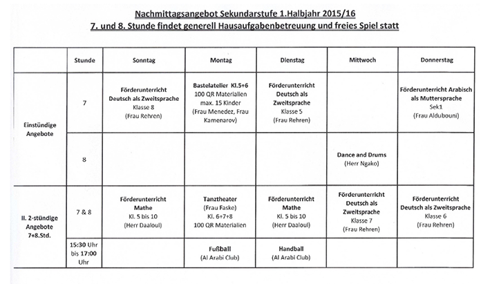 First, I like to wish you again a beautiful Eid holiday on behalf of the school community. Classes start again on Sunday, 04.Oktober 2015th The afternoon activities start this week and will be supplemented depending on spatial and human resources. Currently the afternoon program takes place as follows: