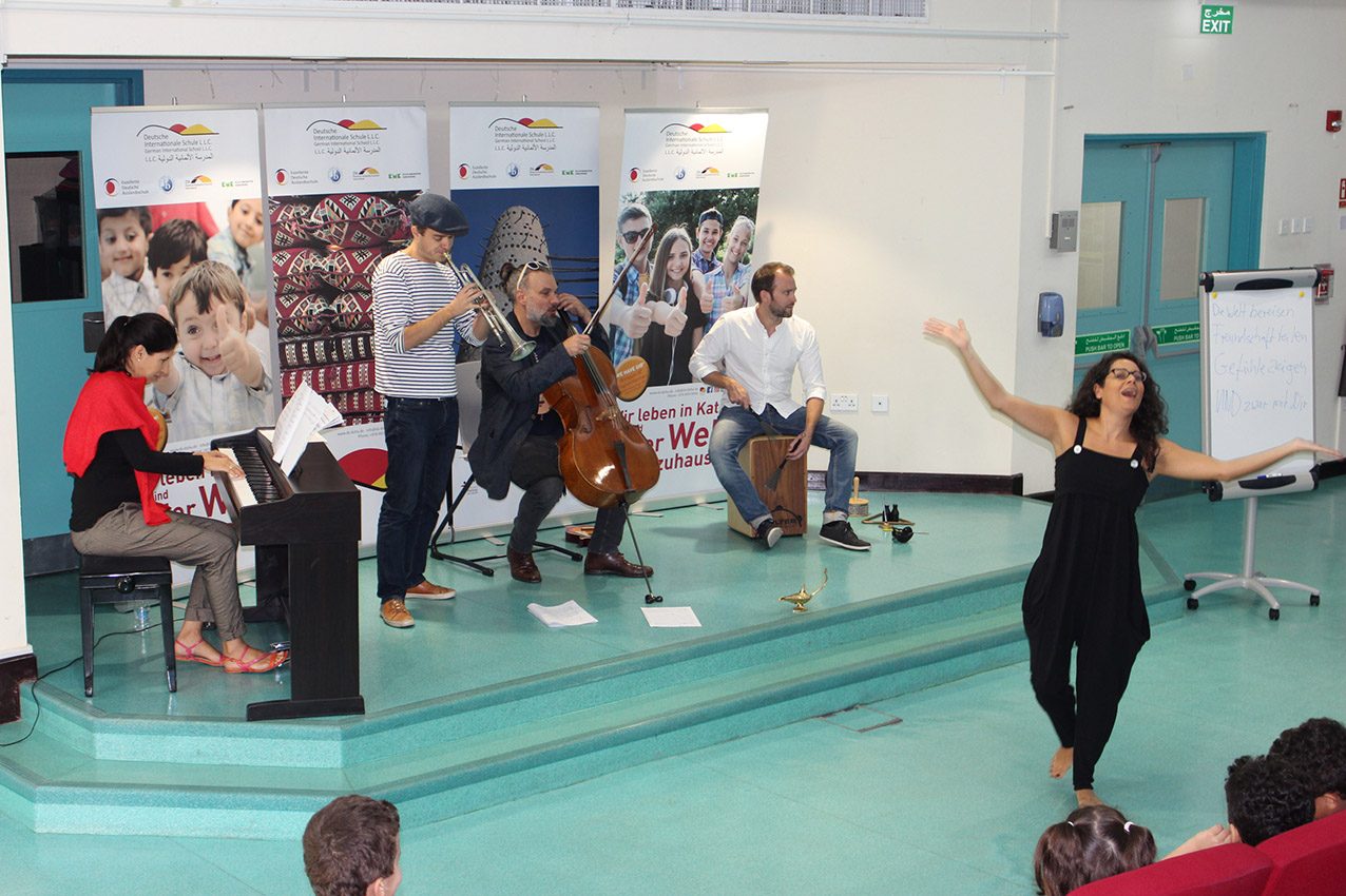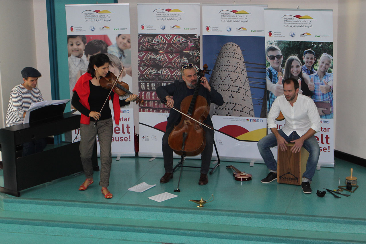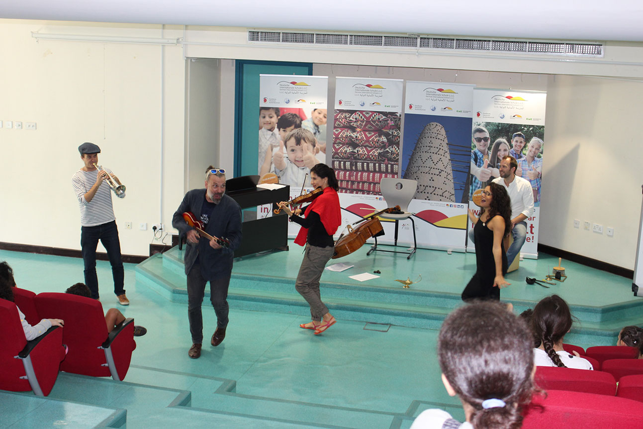 The five musicians Christoph Schmitz, Patrizia Portz, Sevine Abi Aad, Joris Laenen and Ferdinand Schäfer, all members of the ensemble EMOCIÓN performed at the DIS Doha for pupils from grade 1 to 5 “Ükelchens Reise”. Ükelchen is a musician, he finds a magic lamp, unleashes a virtual body that speaks to the children and guides them through the different cultures and languages. In a fantastic performance, the musicians have brought the cultural identity, the diversity of languages and also a high degree of humanity closer to the students. All of the students enjoyed “Ükelchens Reise”. We thank the musicians very much for this initiative at the DIS Doha and for the opportunity to set another accent in music education.