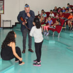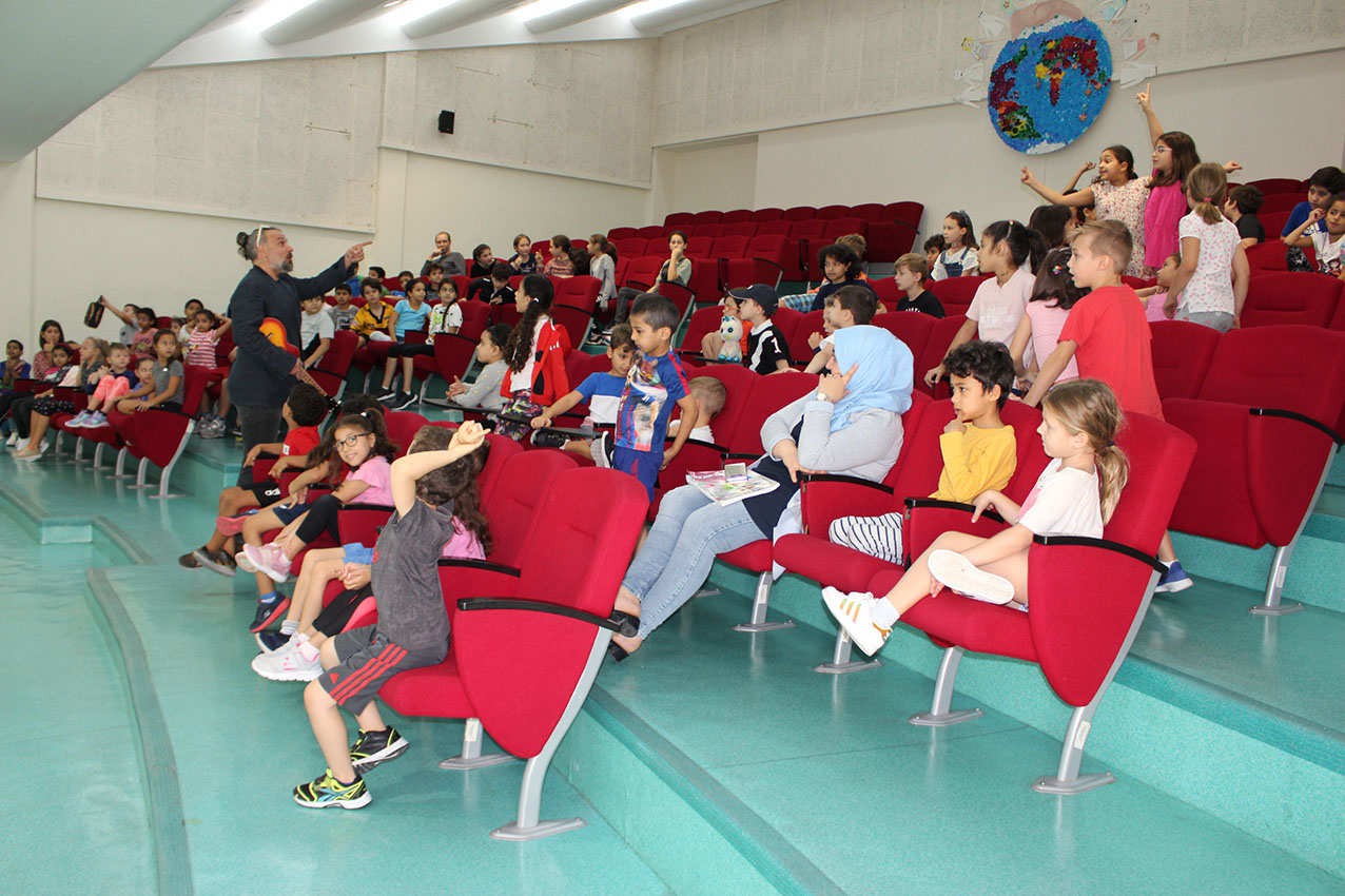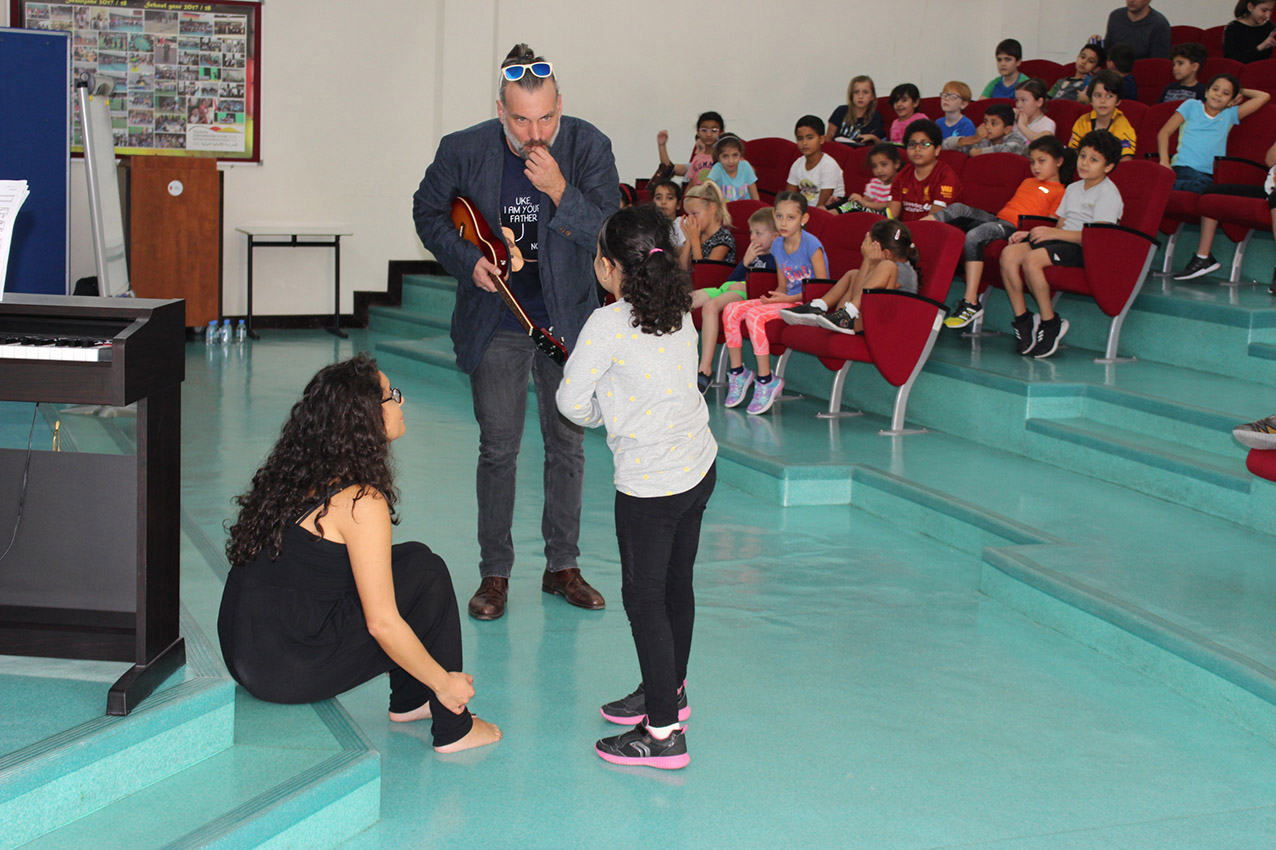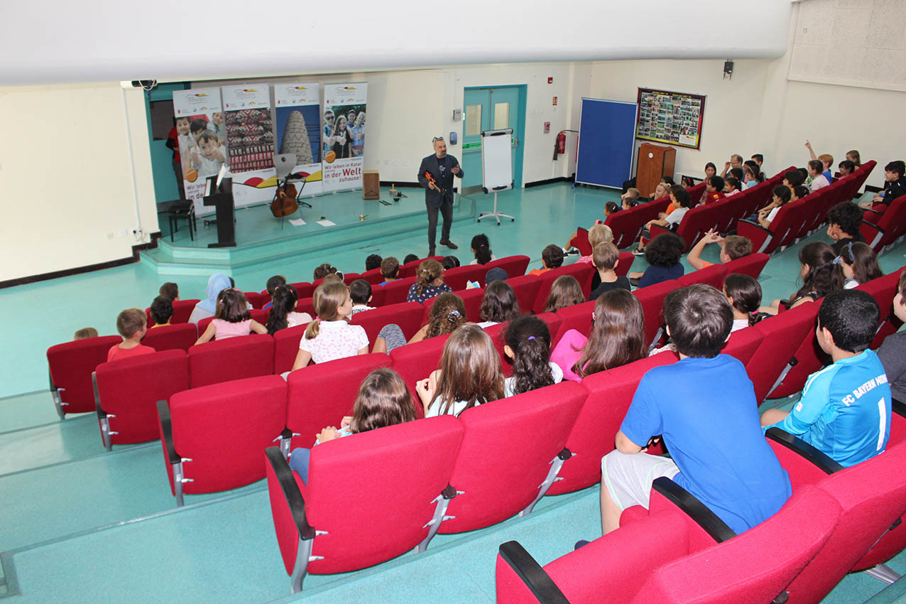 The five musicians Christoph Schmitz, Patrizia Portz, Sevine Abi Aad, Joris Laenen and Ferdinand Schäfer, all members of the ensemble EMOCIÓN performed at the DIS Doha for pupils from grade 1 to 5 “Ükelchens Reise”. Ükelchen is a musician, he finds a magic lamp, unleashes a virtual body that speaks to the children and guides them through the different cultures and languages. In a fantastic performance, the musicians have brought the cultural identity, the diversity of languages and also a high degree of humanity closer to the students. All of the students enjoyed “Ükelchens Reise”. We thank the musicians very much for this initiative at the DIS Doha and for the opportunity to set another accent in music education.