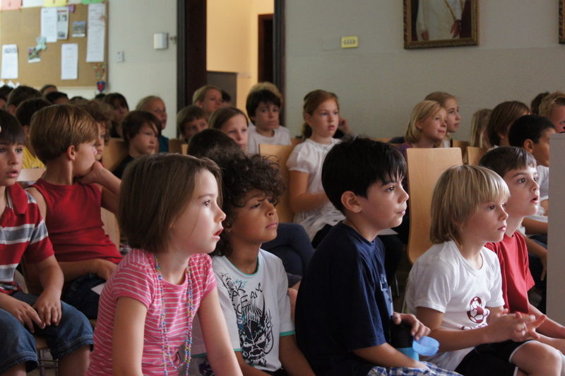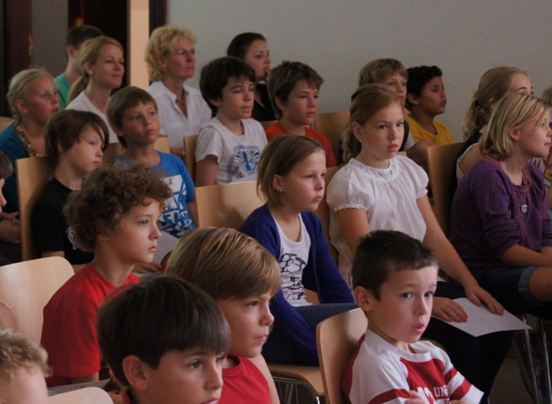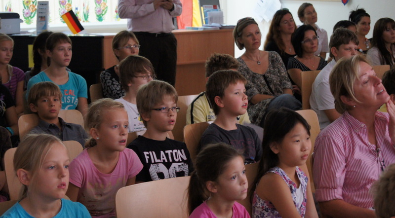 Alle Schüler, Lehrer und Gäste versammelten sich im Foyer der Schule.
