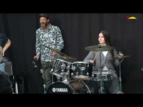 Im Anschluss erhielt unsere Schulband – Emma, Julia, Anni und Mike – einen zweistündigen Workshop mit den Musikern. Gemeinsam wurde an dem Stück „Feel Like Dancing“ gearbeitet. Dabei standen musikalische Gestaltung, Zusammenspiel sowie Hinweise zum Instrumentalspiel und zur Bühnenpräsenz im Mittelpunkt.
