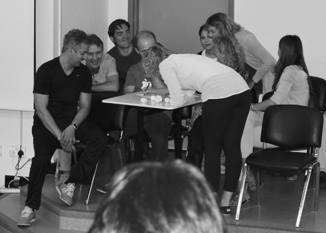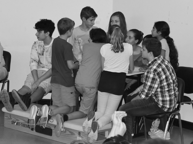 - Aufgabe: Einen Stuhl zu zweit ohne Benutzung der Hände transportieren.